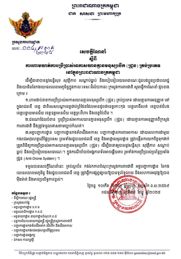 សេចក្តីណែនាំស្តីពីការរឹតបន្តឹង និងហាមឃាត់ការប្រើប្រាស់អាកាសយានគ្មានមនុស្សបើក (ដ្រូន) ដោយគ្មានការអនុញ្ញាតក្រសួងការពារជាតិបានចេញសេចក្តីណែនាំ ស្តីពីការហាមឃាត់ដាច់ខាតលើការប្រើប្រាស់អាកាសយានគ្មានមនុស្សបើក (ដ្រូន) គ្រប់ប្រភេទនៅទូទាំងប្រទេស ជាពិសេសតាមបណ្តាខេត្តជាប់ព្រំដែន។
